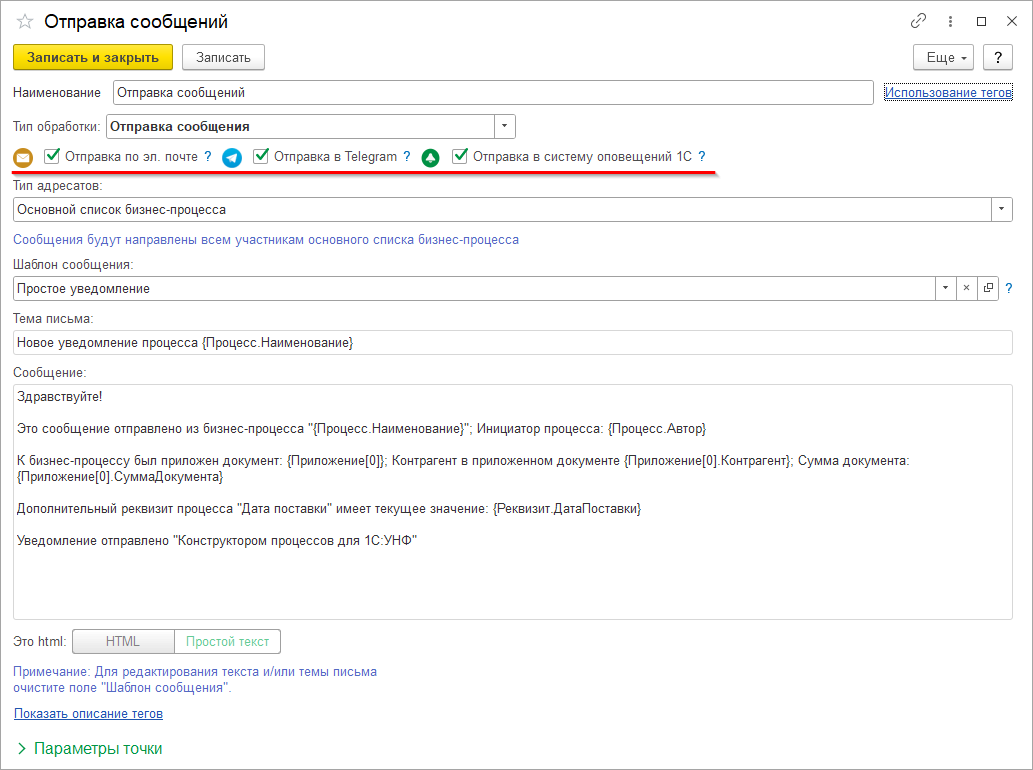 Механизм отправки сообщений из произвольных мест маршрута бизнес-процесса позволяет создать достаточно мощный механизм уведомлений пользователей вашей программы. В случае, если необходимо отправлять сообщения с разным текстом для эл. почты и Telegram (или для уведомлений системы), то можно в маршруте бизнес-процесса поставить последовательно несколько разных точек обработки, с разным текстом сообщений и включить в них соответствующий флажок транспорта (эл. почта, Telegram, оповещения).