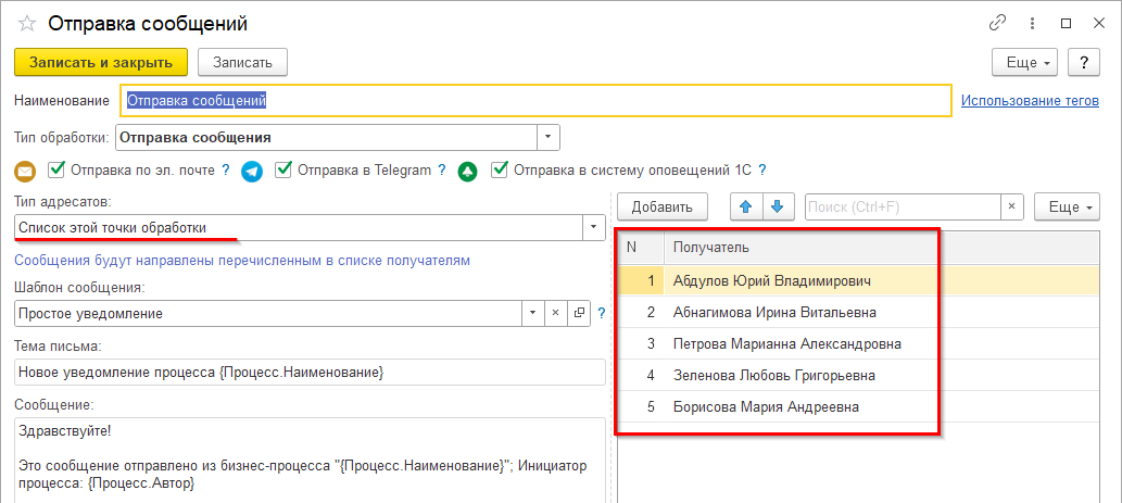 На рисунке выше показан пример настройки отправки сообщения по списку из пяти пользователей.